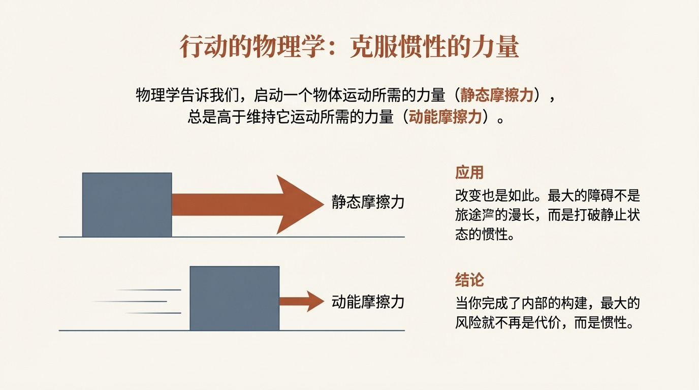 这时,物理学给了我们最好的启示。克服“静摩擦力”(让一个静止的物体开始运动所需的力量)总是比克服“动摩擦力”(维持物体运动所需的力量)更难。改变也是如此,启动的那一刻是最困难的。