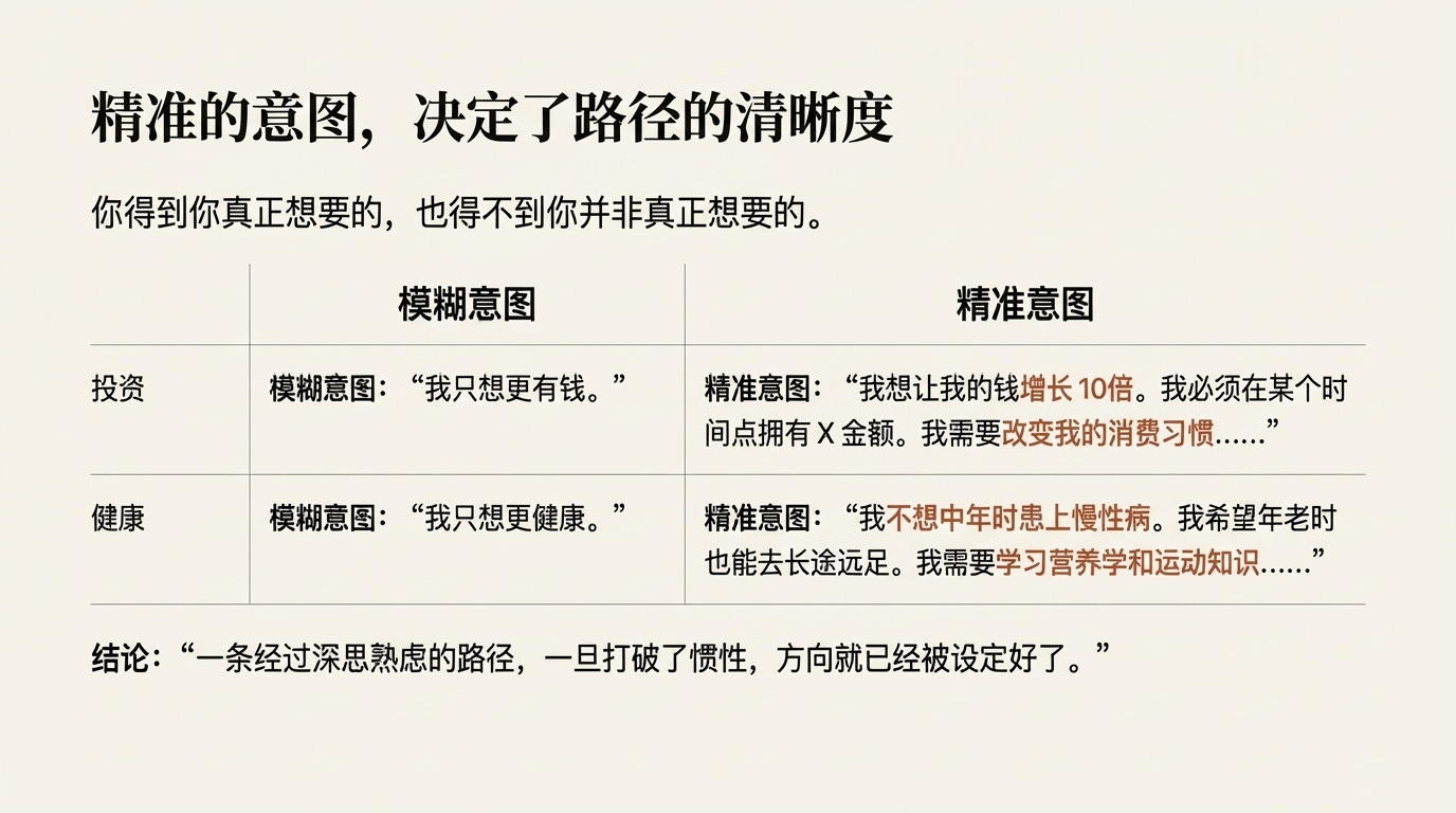 精确的目标(真正的行动): “我想在某个时间前将我的投资增长10倍”或“我希望年老时也能去长途远足”。这种精确性强迫你直面改变所需的真实成本和具体步骤,比如改变消费习惯、学习投资知识,或是坚持锻炼和健康饮食。