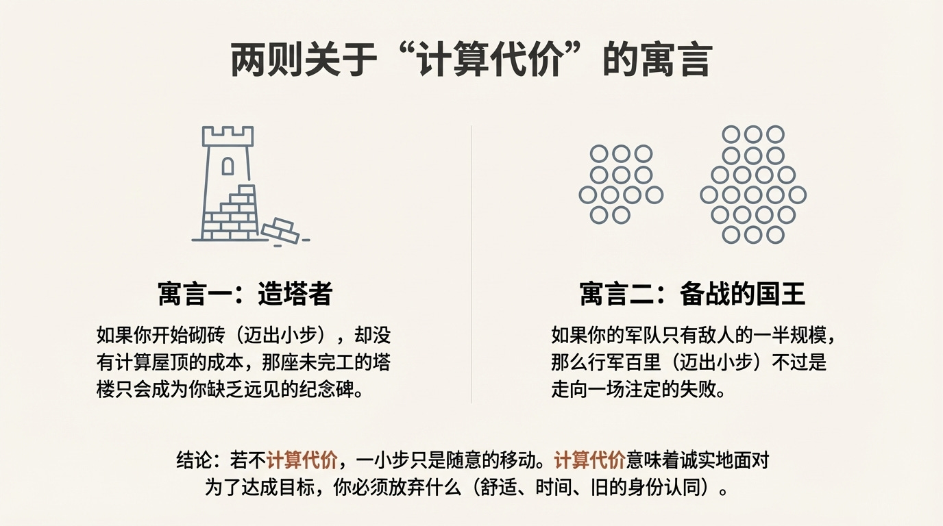 我们普遍认为,改变始于行动。但真正的第一步是内在的、战略性的思考,它发生在任何具体行动之前。没有经过深思熟虑的行动是鲁莽且注定失败的。就像那位没有计算屋顶成本就开始砌砖的工匠,你最初的努力最终只会沦为一座“纪念你缺乏远见的纪念碑”。又或者像那位不评估敌人实力就率军出征百里的国王,你的小步骤不过是“走向一场注定失败的长征”。