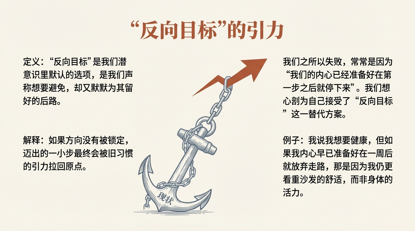 我们常常忽视一个强大的内在力量:反向目标(Anti-Goal)。这是我们潜意识里真正留恋的舒适区或旧习惯,它如同一个默认设置,拥有一种强大的引力。这个反向目标是我们对现状的“潜意识邀请”。