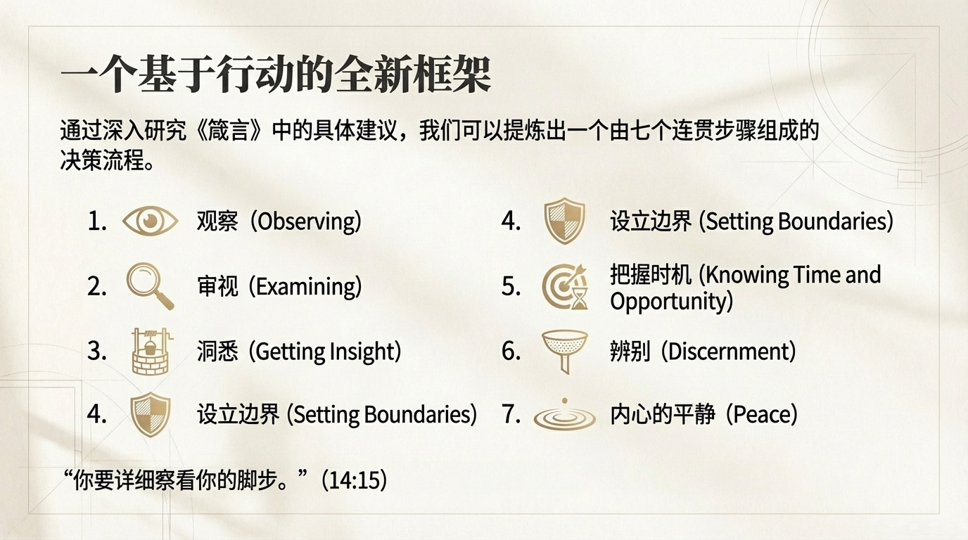 这个框架并非一个随意的清单,它代表了一个驾驭复杂局势的逻辑流程循环:你先观察,然后审视数据,从而获得洞察。接着,你运用辨别力来过滤风险,设立界限,并在恰当的时机行动——这一切都使你能够从平安的状态出发去执行。